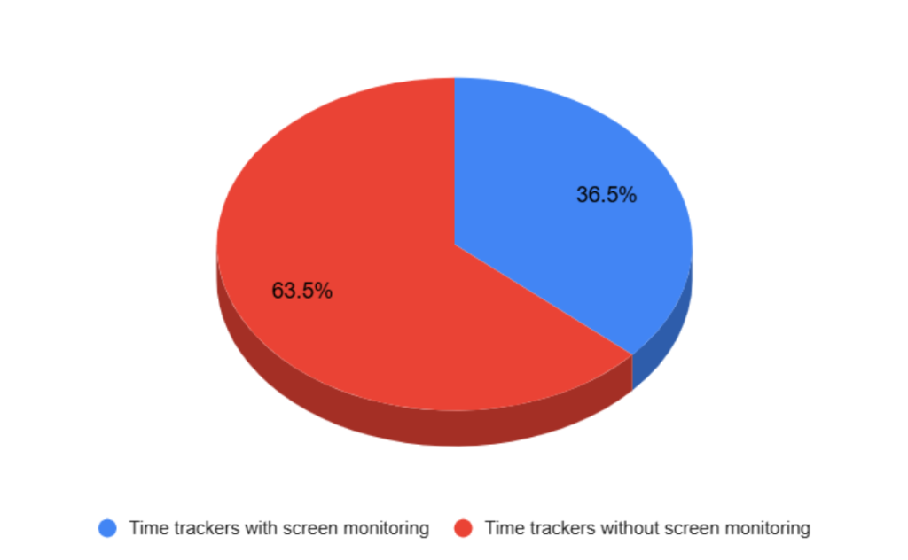A quick independent study featuring 52 time trackers picked at random showed that about 36.5% (19) can take screenshots, and the remaining 63% (33) lack the screen-capturing feature.