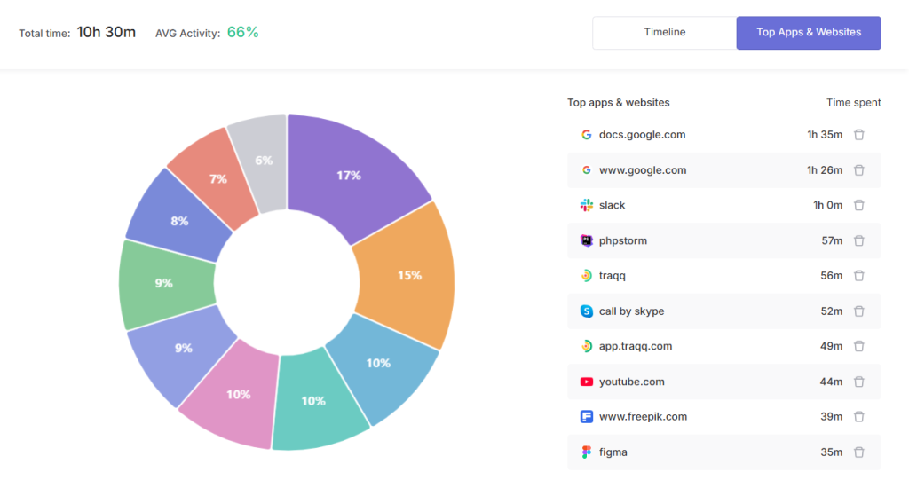 Without providing screenshots, the tool can paint the complete picture about an employee’s workday by showing how long they spent on a website or app, peak work periods, and hours when they were less active.
