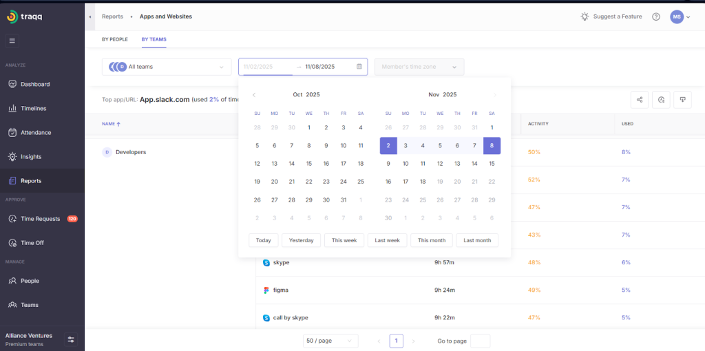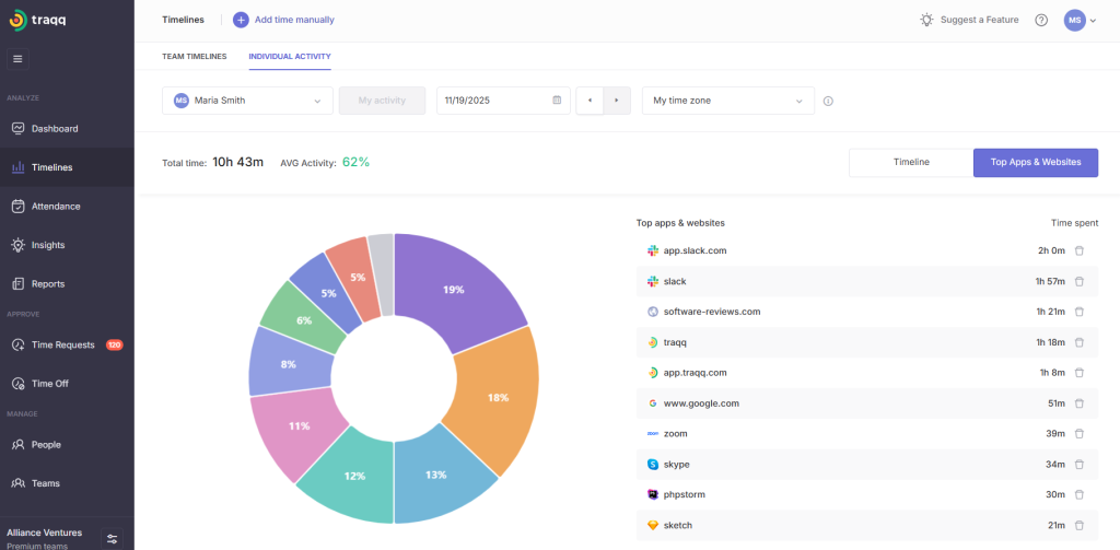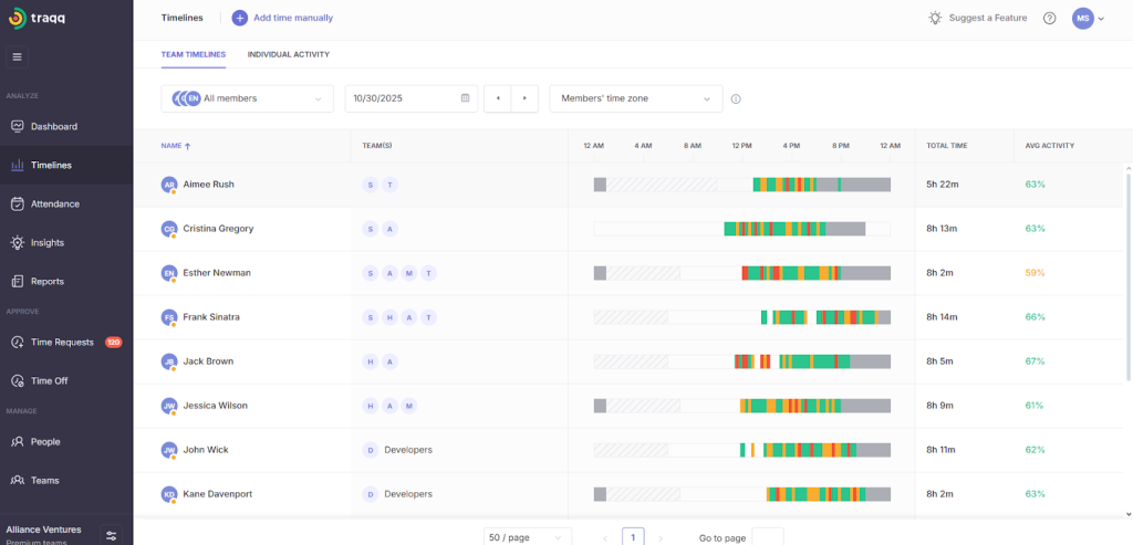 Time-tracking solutions like Traqq and Jibble are excellent for assessing productivity from multiple angles. For example, Traqq’s Timelines page shows how active an employee or team has been over a specific period.