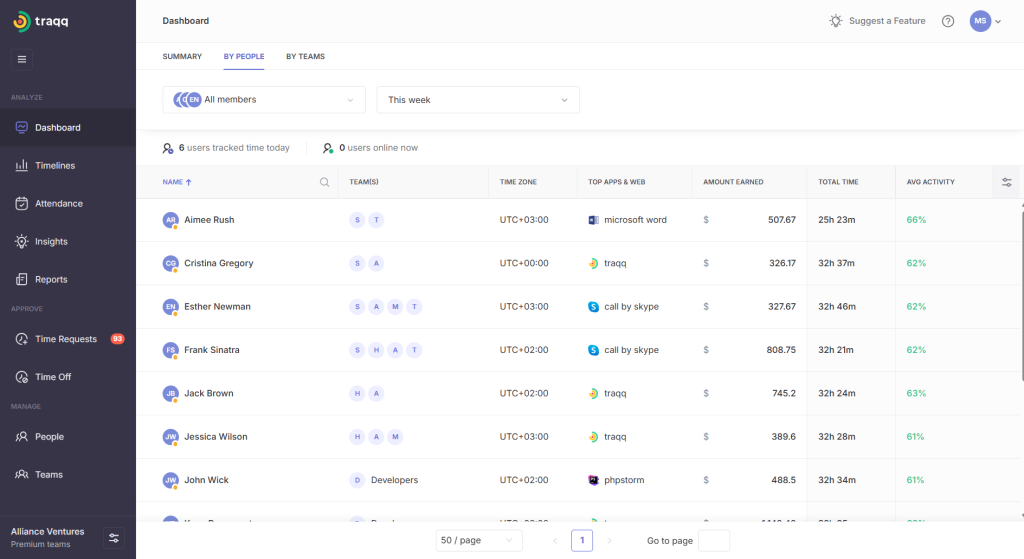 Traqq uses mouse and keyboard interactions to measure active and idle hours, but does not collect screenshots or record any input data. It displays every team member’s total work hours and activity levels on the manager’s dashboard.