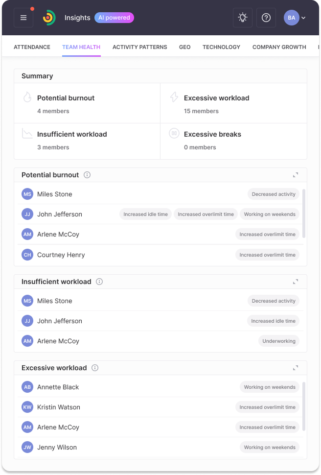 Get notified about concerning patterns like consistent weekend work or sudden activity drops.